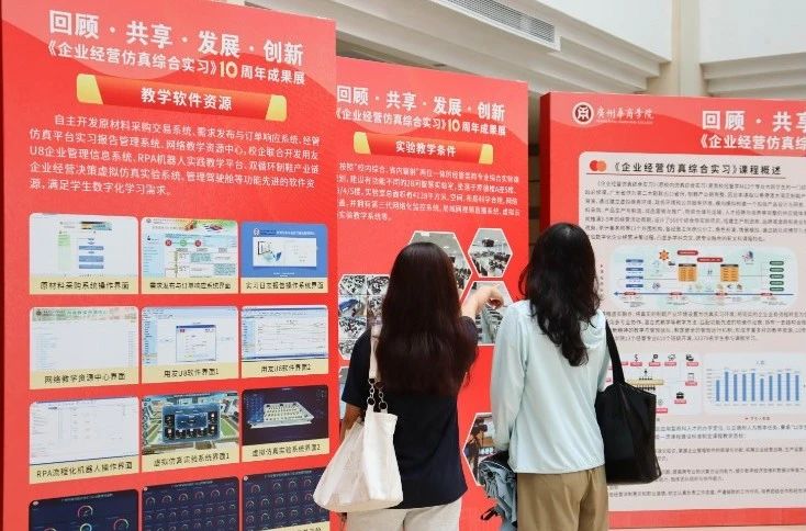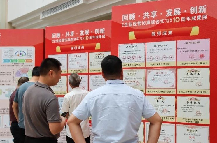 在董事长和校领导的关心和支持下,课程取得了广东省教学成果奖一等奖、广东省线下一流本科课程等一系列可喜成绩。展览的现场,一系列丰富多样的展板陈列在图书馆大厅,内容丰富,形式多样,全面回顾《企业经营仿真综合实习》10年的发展历程、教学理念和数字化教学取得的创新成果。