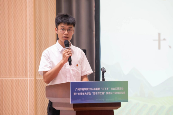 广东青年大学生“百千万工程”突击队“惠韵乡创”社会实践服务队队长李钦鹏发言。他代表即将出征的同学们郑重承诺,将珍惜本次实践机会,听从组织安排,树牢安全意识,把理论知识应用于实践,将所学的知识转化为服务人民的具体行动。在实践中,争当突击队,勇做生力军,立志做有理想、敢担当、能吃苦、肯奋斗的新时代好青年,以谦虚的态度学习,以真诚的心服务奉献乡村。