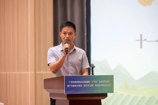 实践地干部代表黄田镇党委副书记、佛山市驻黄田镇帮镇扶村工作队队长梁柱发言。他回顾往年我校暑期“三下乡”社会实践取得的优异成果,并向今年参加社会实践活动的同学们提三点希望和要求:一是希望大家充分发挥专业优势,深入开展调查研究,为乡村振兴提供有力的支持。二是积极参与黄田镇的各项工作,深入群众,为他们解决实际困难和问题。三是希望大家严格遵守纪律,服从组织安排,注意安全,确保活动顺利进行。