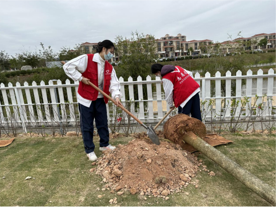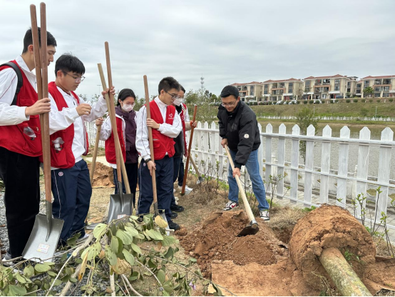 春回大地万物复苏,植树添绿正当时。2月27日下午,增城区总工会联合荔湖街在太平都市农业公园开展“携手添新绿,共植职工林”广州职工公益林增城片区2024年首场植树活动。为深入学习贯彻彻习近平生态文明思想,助力省“百千万工程”和绿美广东生态建设,引领华商青年担当力行、服务社会,我校团委组织10余名学生志愿者参与本次活动。