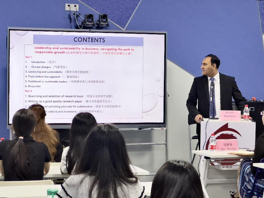 为拓宽大学生的国际视野,了解管理学和领导科学的最新研究成果,2023年11月8日,国际学院在启智楼401举行主题为“Leadership and sustainability in business:navigating the path to responsible growth”(企业的领导力和可持续性:引领负责任的增长之路)的文化素质讲座。巴基斯坦籍Arshad Muhammad博士担任主讲嘉宾,伟德体育国际学院院长回雁雁、巴基斯坦籍教师Aneela Qadir博士、国际学院ACCA专员姚晓敏以及来自国际学院、健康医学院、管理学院、外国语学院、文学院、数据与科学学院的30多名大学生现场聆听了讲座。