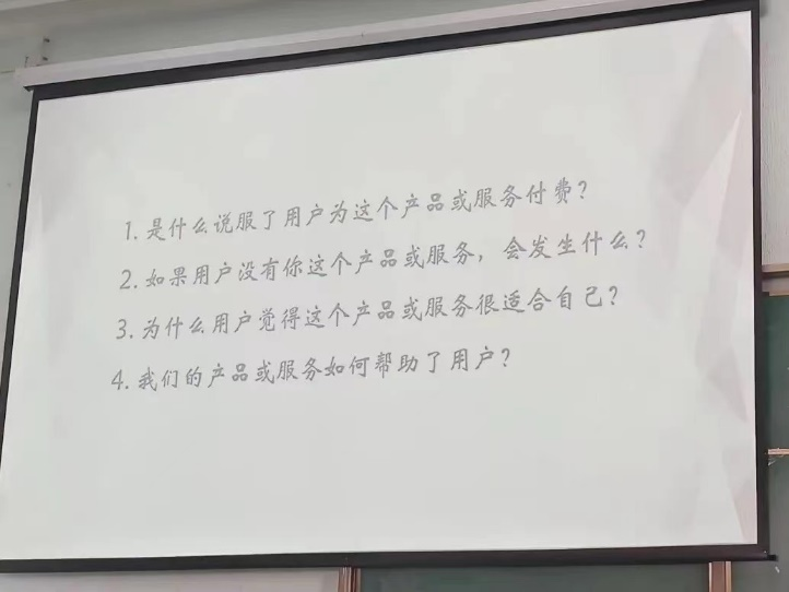 老师通过四个问题与同学们探讨,引导同学们一步步探索作为大学生的创新创业实践价值。