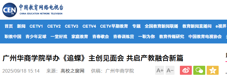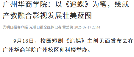 近日,校园短剧《追蝶》主创见面发布会在伟德体育广州校区创科楼顺利举办。该活动集中展示了我校新叙事内容产业学院以产教深度融合与校企紧密合作为抓手,积极推动实现优质影视资源从创意到落地全链条协同的卓越成果,吸引光明日报、中国网、环球网、中国教育电视台、中国青年网、中国教育之窗、中国高校之窗、今日头条、广东教育头条等多家权威媒体专题报道。9月23日,这部作品将面向全国观众播出。