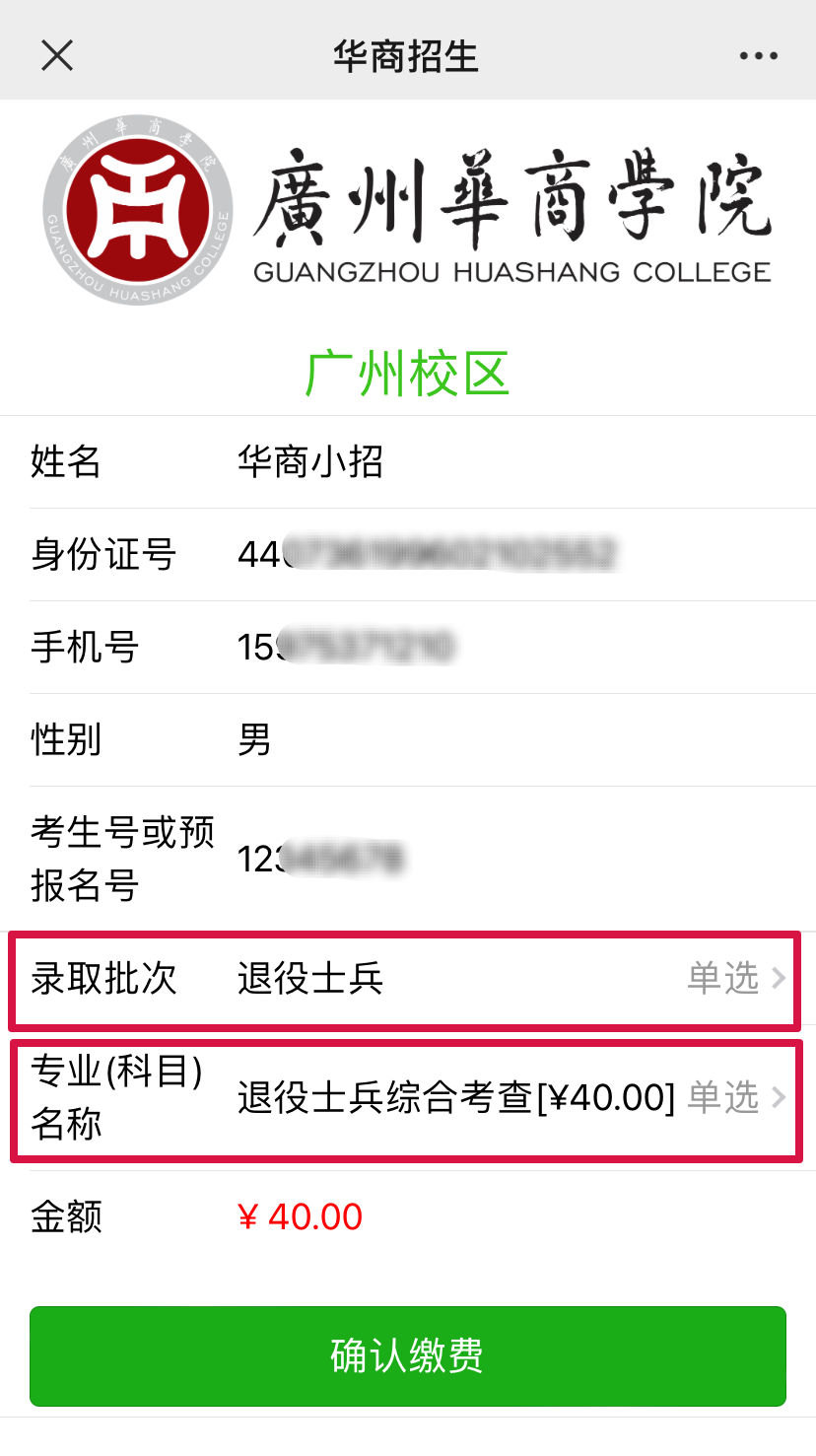 方式2. 进入“伟德体育招生办公众号”,选择菜单栏“招生资讯”—“报考费”;进入缴费页面;准确填写个人信息,点击“下一步”;选择退役士兵批次及科目;核对相应金额,无误后点击“确认缴费”即可。
