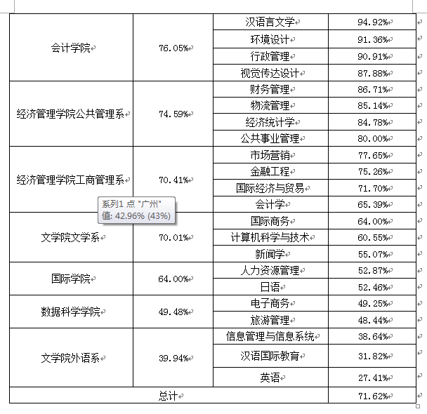 从表中看,学校2019届毕业生就业的专业对口率平均为71.62%。其中,我校2019届毕业生初次就业专业对口率在其所在院系中,文学院艺术设计学系专业对口率最高,为93.87%;其次是经济管理学院经济与金融系,为81.80%;再次是会计学院,为76.05%;专业对口率较低的为国际学院、数据科学学院、文学院外语系,分别为64.00%、49.48%、39.94%。