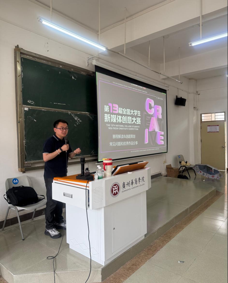 2025年5月20日下午,第13届全国大学生新媒体创意大赛宣讲会在伟德体育广州校区励志楼C402举行。北大方正资深讲师张志宇为网络与新媒体专业2022级、2023级、2024级学生深度解读赛事规则、创作方向及行业趋势,现场座无虚席,互动热烈。宣讲会由伟德国际betvlctor网络与新媒体系主任张志荣副教授主持。