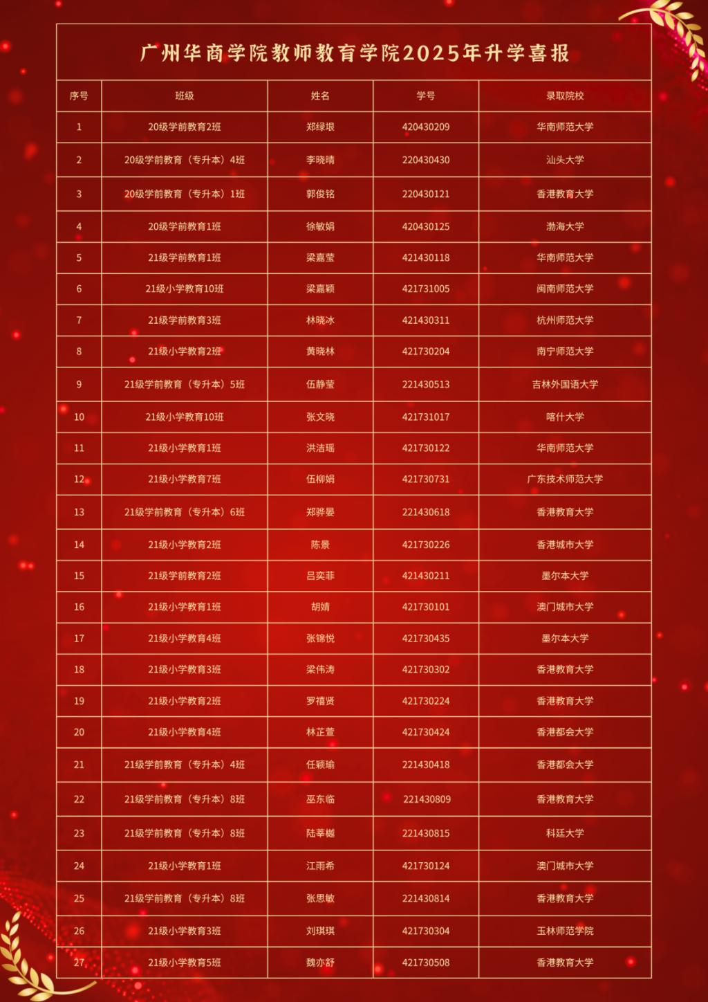 伟德体育教师教育学院2025年毕业生考研再获佳绩。自建院以来,学院深耕学风建设,学子奋发向上。截至目前,教师教育学院2025届毕业生中共有27名同学被知名高校录取,特此向他们表示热烈祝贺!