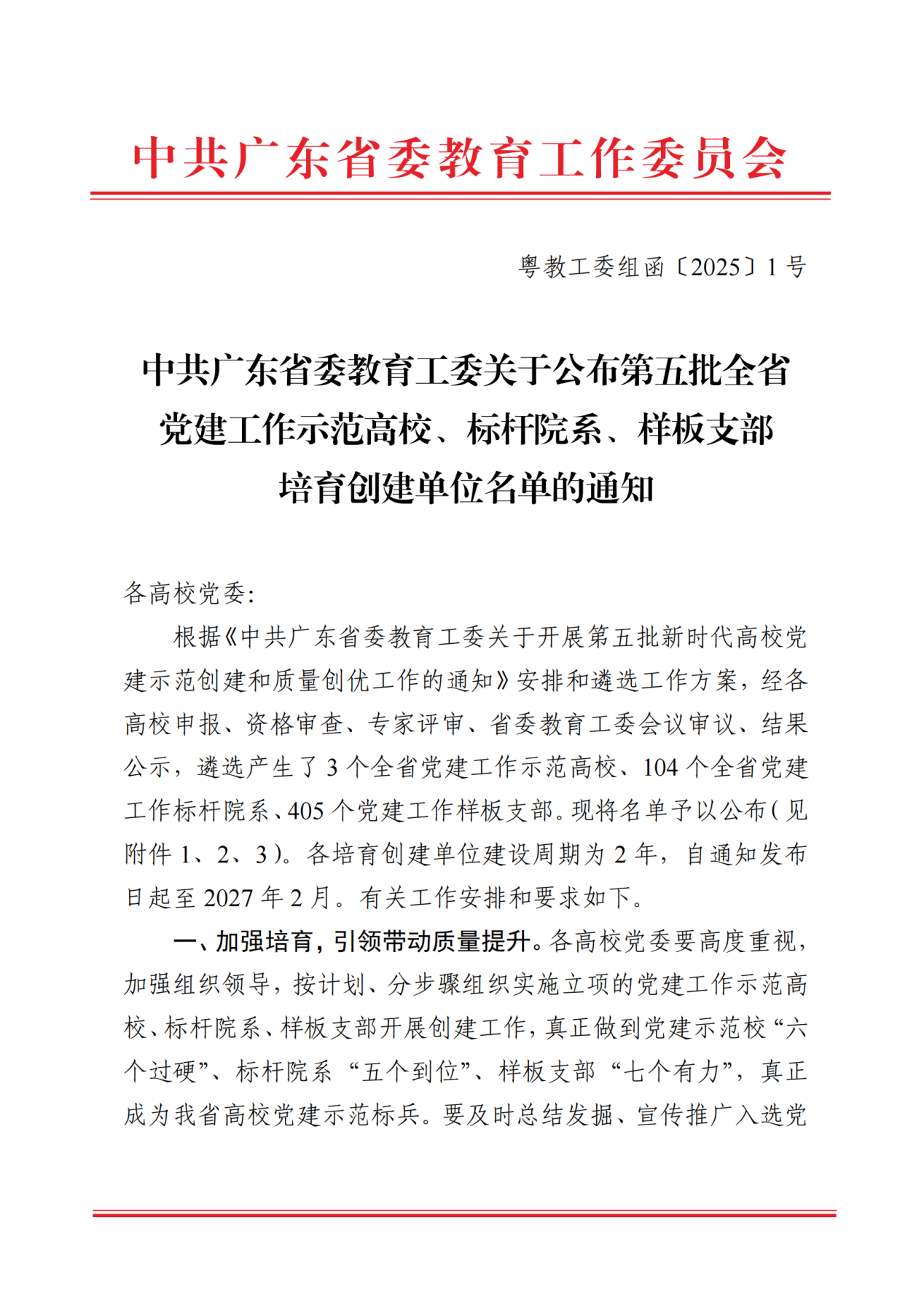 近日,中共广东省委教育工委公布了《第五批全省党建工作示范高校、标杆院系、样板支部培育创建单位名单》,伟德体育人工智能学院党委成功入选第五批“全省党建工作标杆院系”培育创建单位。这是对我校党建工作的高度肯定,也是人工智能学院党委在党建工作中取得的又一重要成果。