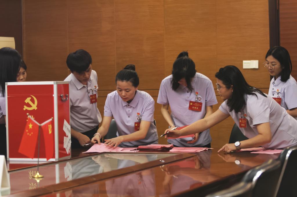 大会选举阶段,总监票人员清点人数后,监票人当众检查票箱,检查无误后,计票人在监票人监督下向与会人员分发选票。主持人宣读选票填写方法和注意事项。在选票填写结束后,有选举权的党员依次进行投票,本次投票为无记名投票。
