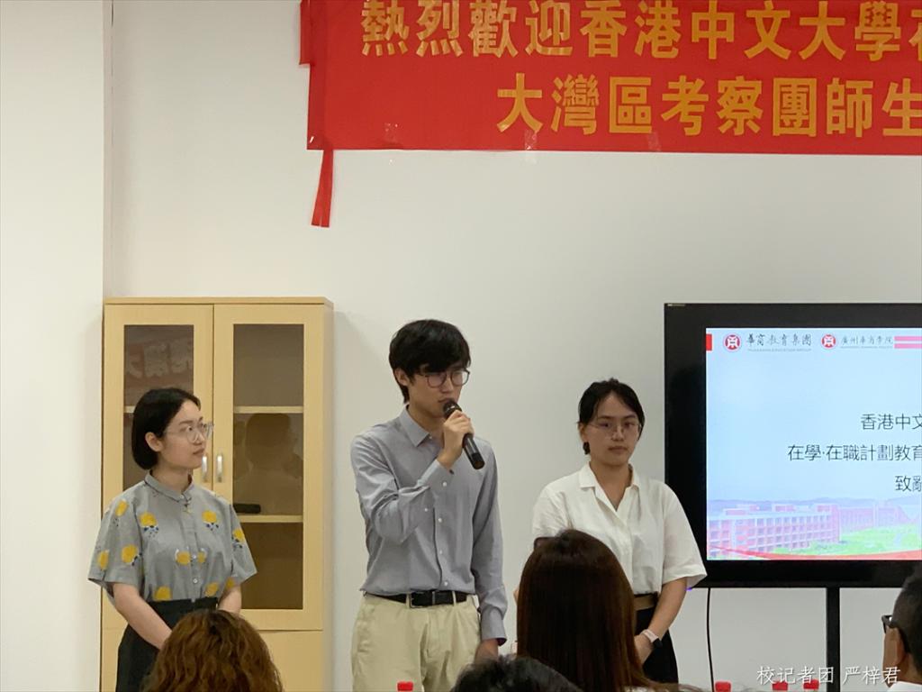 为深入了解粤港澳大湾区教育发展状况,进一步推进教育教学水平提高,实现优秀资源共享,近日,香港中文大学在学·在职计划教育部总监赖汉荣、助理总监傅贝诗、职涯组助理经理黄晓欣,香港中文大学考察团学生等一行代表团参访伟德体育增城校区,与我校代表在创科楼进行座谈交流。伟德体育副校长王锦秀、广州华商职业学院副校长余家军、伟德体育国际学院院长回雁雁以及伟德体育学生代表参加本次座谈。本次座谈由广东华商教育集团学术专员陈雯姗主持。