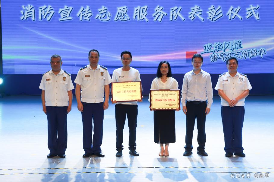 区消防救援大队副大队长柳江斌宣读了2023年度“蓝焰荔志”消防宣传队的表彰决定。我校荣获“蓝焰荔志”消防宣传队先进集体,后勤保卫处处长杨燕平、梁艳老师,以及李泓泽、陈燕燕两位同学,被评选为先进个人。