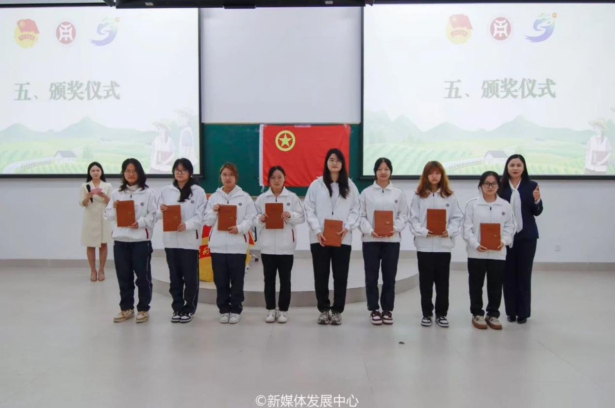 团四会市委书记崔冰娜、龙甫镇副镇长臧路晴、佛山市驻黄田镇帮镇扶村工作队队长黄毅飞分别为我校各优秀“百千万工程”直播突击队及个人进行表彰并颁发纪念品。今年上半年,在团四会市委的支持下,在黄田镇人民政府、佛山市驻黄田镇帮镇扶村工作队及一念众创文化发展有限公司、四会市乡念优农农业发展有限公司的帮助与指导下,我校团委组织“百千万工程”直播突击队开展“新媒体+助农”直播。12支助农直播突击队,直播时长总计近1500分钟,直播间点赞量千余次,销售量百余单,有力促进了四会市黄田镇农产品销售与农户增收。