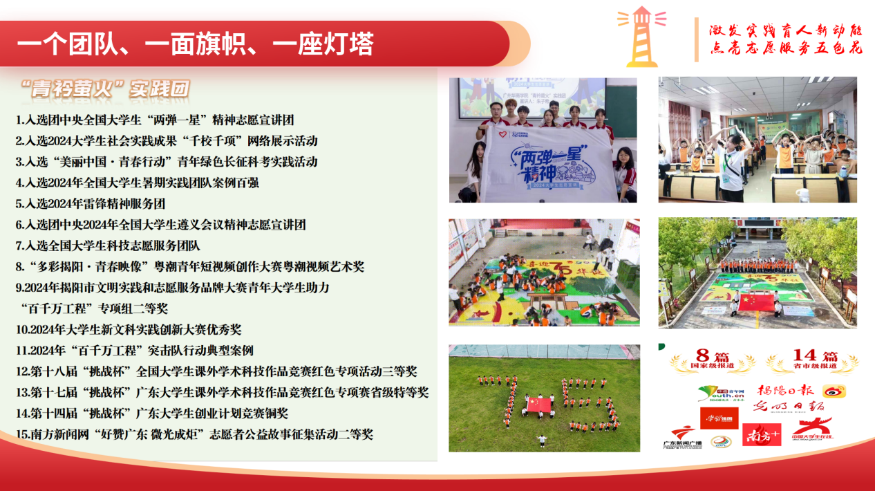 近日,2024年第十届全国大学生暑期实践展示活动案例发布。这是中国青年报社连续第十年举办该活动。经校方推荐、团队自荐、网络展示等环节,第十届全国大学生暑期实践展示活动落下帷幕。其中,我校“青衿萤火”百千万工程突击队凭借优异表现成功入选2024年全国大学生暑期实践团队案例百强。