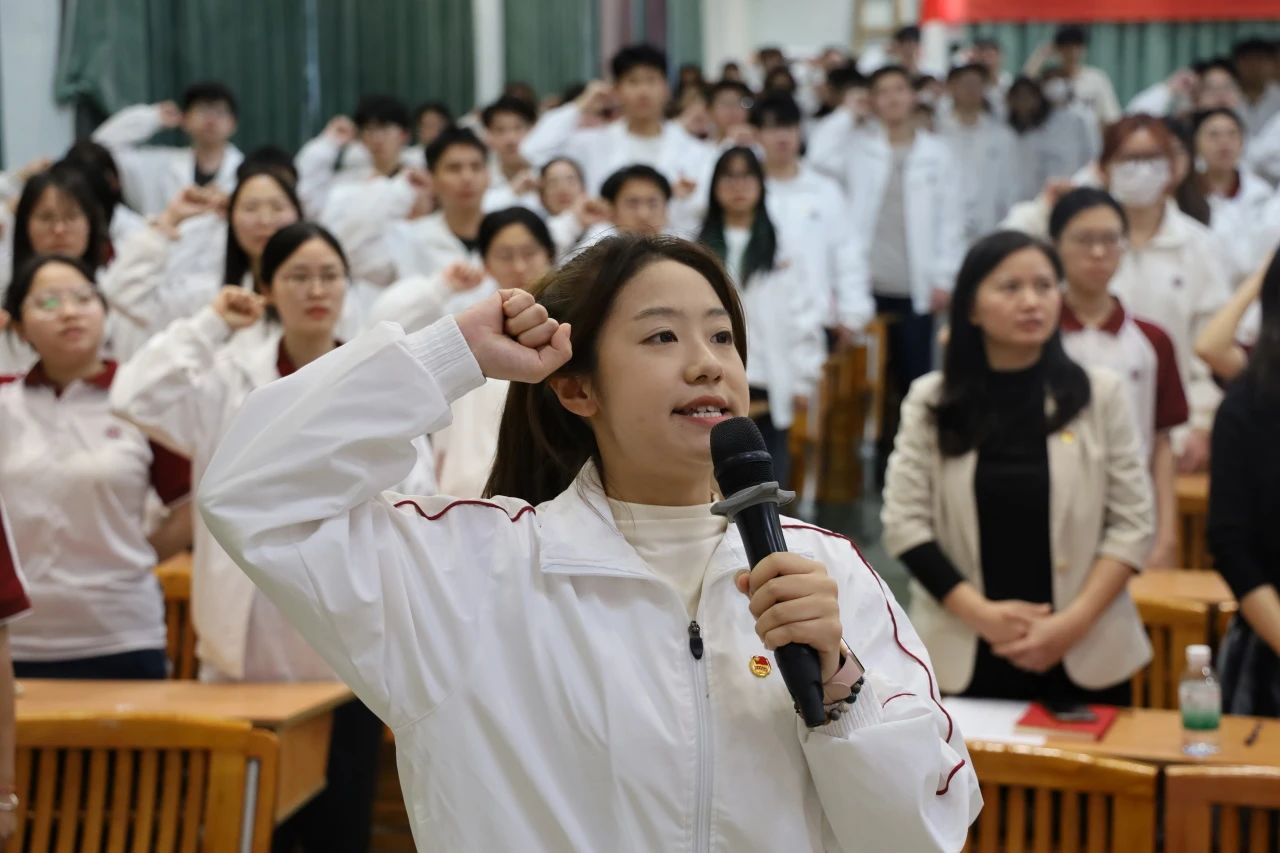 会议尾声,全体参会人员在学生代表芦婉云的带领下宣誓。铿锵有力的誓言在会场久久回响,充分展现出全体师生齐心协力迎接评估的坚定信念。