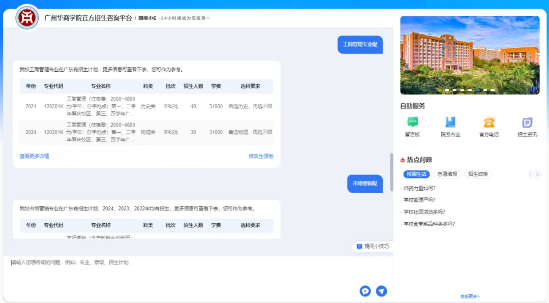 面对复杂的志愿填报、招生政策,或是关于校园生活的点滴疑问,现在只需向“智能机器人小E”咨询,我们的智能问答系统依托DeepSeek大模型的强大语义理解能力,便可以迅速识别你的咨询意图,进行精准回答。
