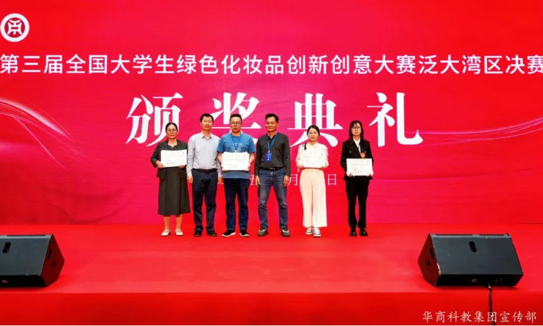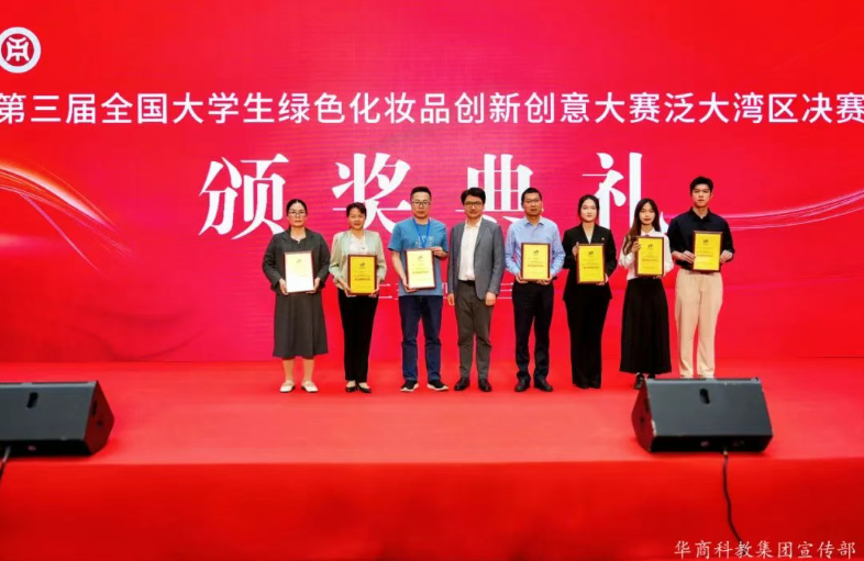 经过上午激烈的角逐,众多优秀团队凭借在原料创新、配方设计、包装设计等方面的出色表现脱颖而出。大赛颁奖环节共表彰荣誉奖、优秀奖、一至三等奖等120余个团队,华商参赛项目“岭南植物多酚抗衰护肤品”“可降解竹纤维美妆包装”分获原料创新与包装设计赛道一等奖,彰显了学校专业教学与实践创新的成效。在热烈的掌声中,获奖团队代表依次上台领奖,由出席嘉宾为他们颁发荣誉证书,这不仅是对参赛团队的高度认可,也激励着更多学生投身绿色化妆品创新领域。