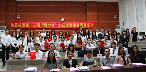2015年5月13日18点30分,由广东财经大学会计学院主办的第十三届“财会杯”科研大赛决赛在其北校区北3-103研究生学术报告厅隆重举行,我院的刘彩兰老师应邀担任本次大赛的评委之一。我院代表队伍Super Team队(队长:李东明,队员:邓锦兴、黄敏仪、黄慧娴)在广财大总决赛的舞台上力战四路群雄,表现优异,最终获得“三等奖”的好成绩,只是以微弱的差距落后于获二等奖广东金融学院。