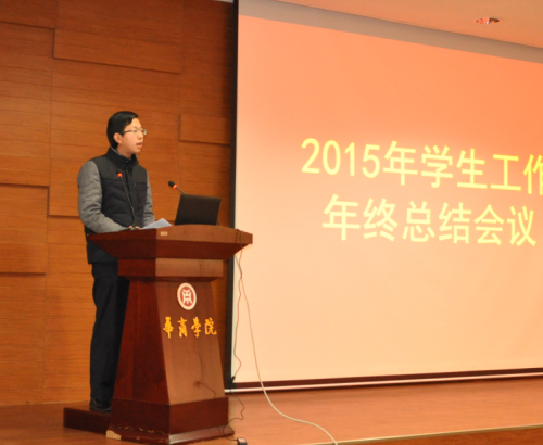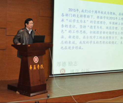 交流汇报环节结束后,刘德平处长作学生工作年度总结报告。2015年,我院学生工作以十周年校庆为契机,秉承“以学生为本”的管理理念,牢固树立全心全意为学生服务的意识,坚持“德育为先、规范管理、突出服务、体现特色”的工作思路,积极探索新时期学生工作的新思路、新方法、新途径,取得一定的成绩。学生的思想比较稳定,良好的学风和校风也在逐步形成。