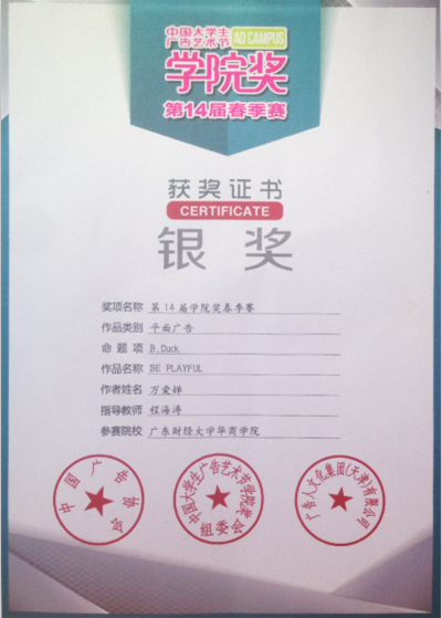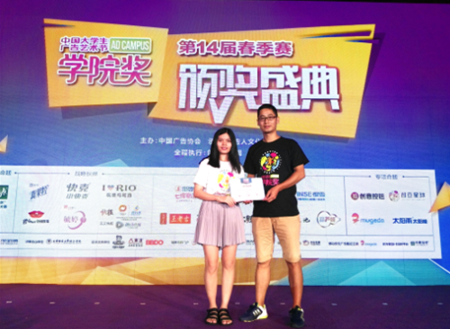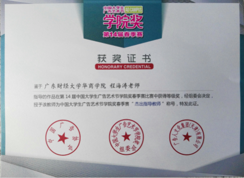 728,华商文学院艺术设计学系万爱婵同学的设计作品在全国1200多所院系师生的138889件作品中脱颖而出,获得第十四届学院奖银奖,指导老师程海涛荣获“杰出指导老师”称号。万爱婵设计团队也受中国大学生广告艺术节学院奖组委会邀请,赴北京中央电视台参加的颁奖典礼。