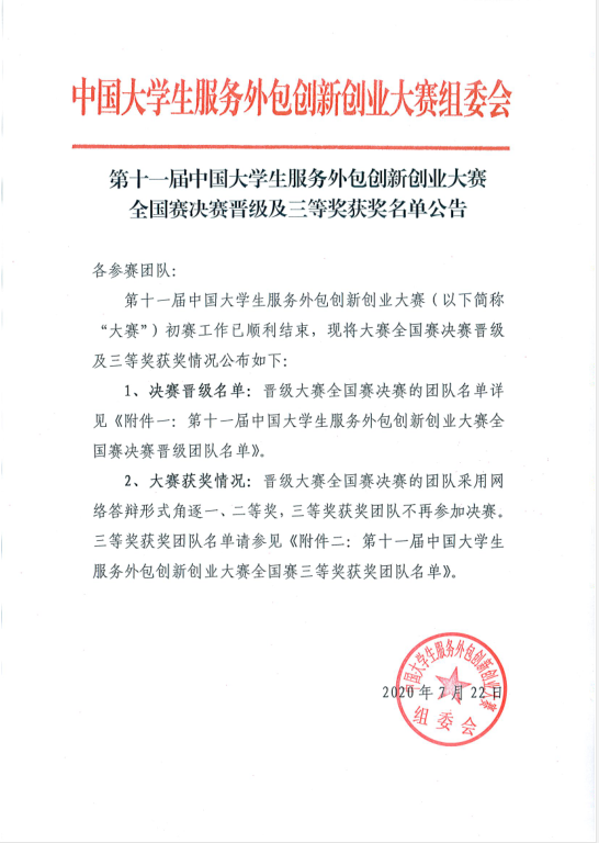 近日,第十一届中国大学生服务外包创新创业大赛组委会公布全国赛决赛晋级及三等奖获奖名单公告,我校有两支队伍再创佳绩,“快乐就完事”成功晋级全国总决赛角逐一、二等奖,“今晚不熬夜1”队获得全国赛三等奖。