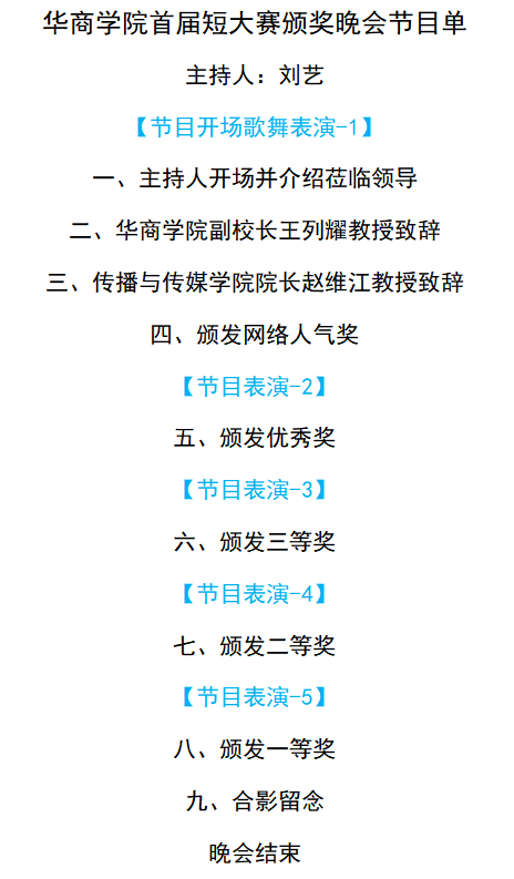 本网讯华商学院首届短视频大赛颁奖晚会将于9月23日晚7时隆重举行。华商学院“首届短视频大赛”正式落下帷幕,为表彰华商首届短视频大赛获奖学生,进一步提升学生专业实践积极性,由华商学院主办、教务处和伟德国际betvlctor共同承办的华商学院首届短视频大赛颁奖晚会将于9月23日(周三)晚7时在华商学院图书馆报告厅隆重举行,届时,将揭晓本次大赛各奖项获奖作品,同时,还有精彩的文艺演出贯穿其中。华商学院校领导代表、教务处领导代表、伟德国际betvlctor领导及各系主任、教职工代表将出席本次活动。传播与传媒新媒体中心将对本次晚会进行网络视频转播和图文直播。