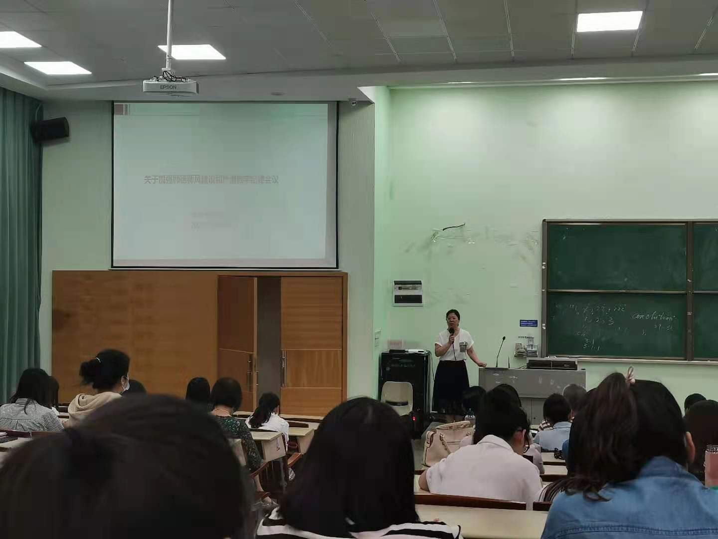 为持续深入贯彻《中共中央国务院关于全面深化新时代教师队伍建设改革的意见》(中发〔2018〕4 号)和《教育部等七部门印发<关于加强和改进新时代师德师风建设的意见>通知》(教师〔2019〕10 号)文件精神,传达2021 年教育系统全面从严治党工作视频会议精神和学校纪委会议精神,外国语学院于2021年4月19日下午16:00,在励志楼B307召开了师德师风建设和严肃教学纪律会议,外国语学院王琢院长、杨润秀副院长、张丽副院长、陈少鸿副院长和外国语学院教职工出席会议,陈少鸿副院长主持会议。