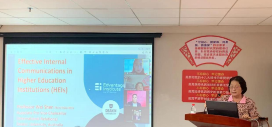 支戈壁副校长指出董事会与学校高度重视教职工职业发展与技能提升,责成相关部门联手华商教育集团海外院校推出系列培训及学术讲座。她指出行政管理人员是学校发展进程的关键环节,行政管理人员也是连接老师和学生的重要桥梁和纽带,行政管理人员的沟通能力是能力提升的重要一环。她希望全体教职工珍惜每次讲座及培训机会,认真学习。