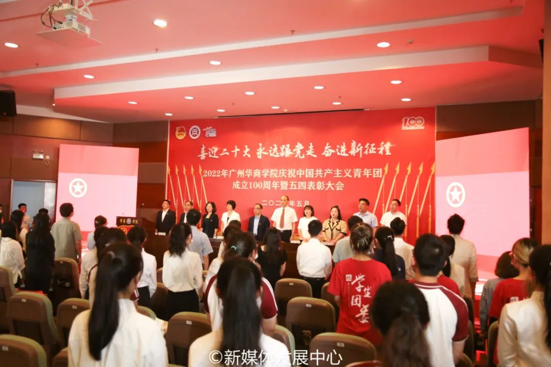 为深入学习宣传贯彻习近平总书记在庆祝中国共产主义青年团成立100周年大会上的重要讲话精神,引导广大华商青年争做理想远大、信念坚定、刻苦学习、锐意创新、敢于斗争、善于斗争、艰苦奋斗、无私奉献、崇德向善、严守纪律的模范,以更加昂扬进取的精神面貌为党的二十大胜利召开献礼,推动共青团思想引领取得更加扎实的工作成效,5月24日中午,校团委在国际会议中心四楼报告厅举行“喜迎二十大 永远跟党走 奋进新征程”伟德体育庆祝中国共产主义青年团成立100周年大会暨2022年五四表彰大会。根据校园疫情防控常态化要求,本次大会设立增城校区主会场,四会校区分会场。采用线上线下结合方式,同步进行网络直播,供华商师生观看学习。