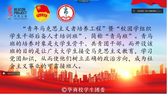 近年来,校团委始终坚持以习近平新时代中国特色社会主义思想为指导,将“青马工程”作为履行“立德树人”根本任务和“思想引领”政治责任的重要载体,推动马克思主义理论在青年中广泛传播。团结引领广大华商青年成长为有理想、敢担当、能吃苦、肯奋斗的新时代好青年,以实现中华民族伟大复兴为己任,“以青春之我,创建青春之国家”,在强国的道路上贡献青春力量。