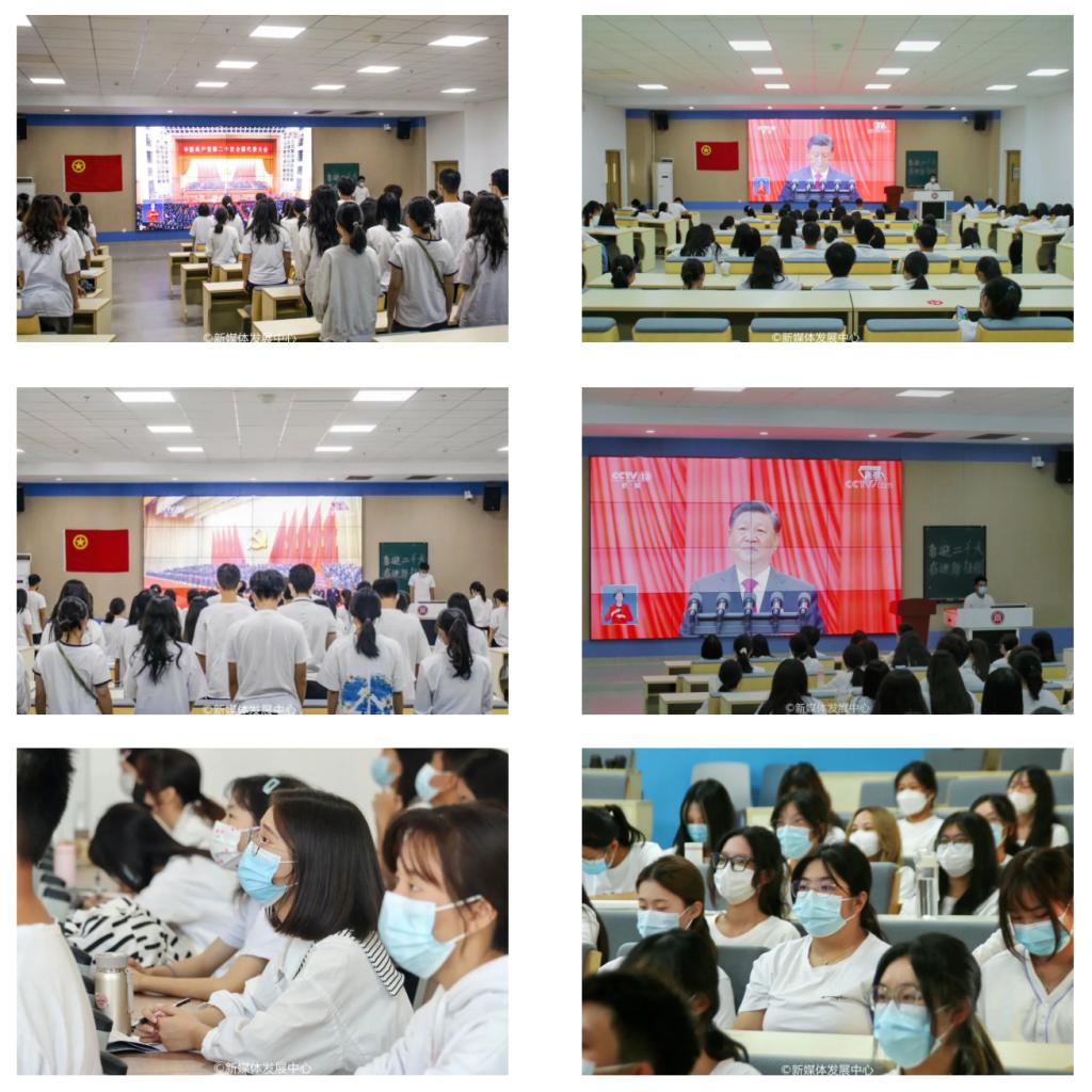 10月16日上午,举世瞩目的中国共产党第二十次全国代表大会在北京人民大会堂隆重开幕。我校团委组织四会校区各校级学生组织、二级学院团支部书记、学生社团等师生代表近200人在8号楼108、6号楼201课室集体观看中国共产党第二十次全国代表大会开幕。其他华商学子主动进行线上线下学习,认真聆听学习习近平总书记代表第十九届中央委员会所作的工作报告。