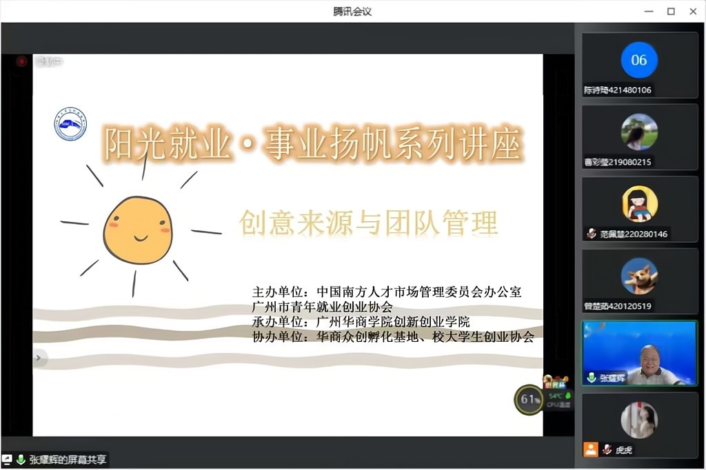 为增强学生团队意识,用发散性思维看待和分析问题,锻炼其创新能力,2022年11月22日由中国南方人才市场管理委员会办公室、广州市青年就业创业协会主办,伟德体育创新创业学院承办,华商众创孵化基地、校大学生创业协会协办的“阳光就业,事业扬帆”就业创业指导进校园活动系列讲座《创意来源与团队管理》以线上的形式举行。