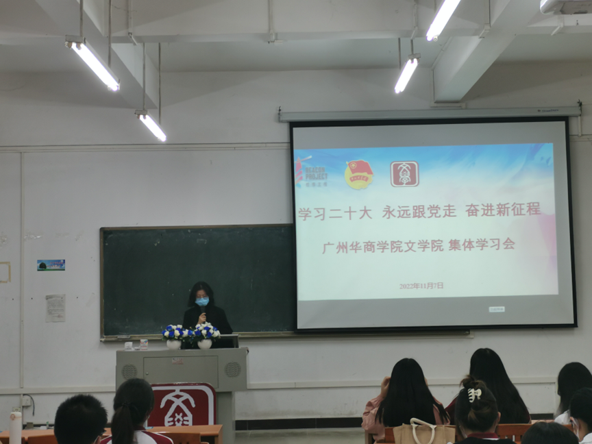 11月27日19:30,外国语学院团委在励志楼开展“学习二十大,永远跟党走,奋进新征程”的专题团课,外国语学院团委书记郭宇洁为学院团委、学生会工作人员、部门负责人及主席团成员授课。郭老师以“讲授+互动”的方式组织同学们深入学习党的二十大报告、习近平总书记参加党的二十大广西代表团讨论时的重要讲话、习近平总书记在党的二十届一中全会的重要讲话等内容,引导学员理解党的二十大的主题、过去5年的工作和新时代10年的伟大变革。通过这次专题学习,外国语学院的学生骨干们更加坚定不移听党话、跟党走的理想信念,立志成为怀抱梦想又脚踏实地,敢想敢为又善作善成,立志做有理想、敢担当、能吃苦、肯奋斗的新时代好青年。