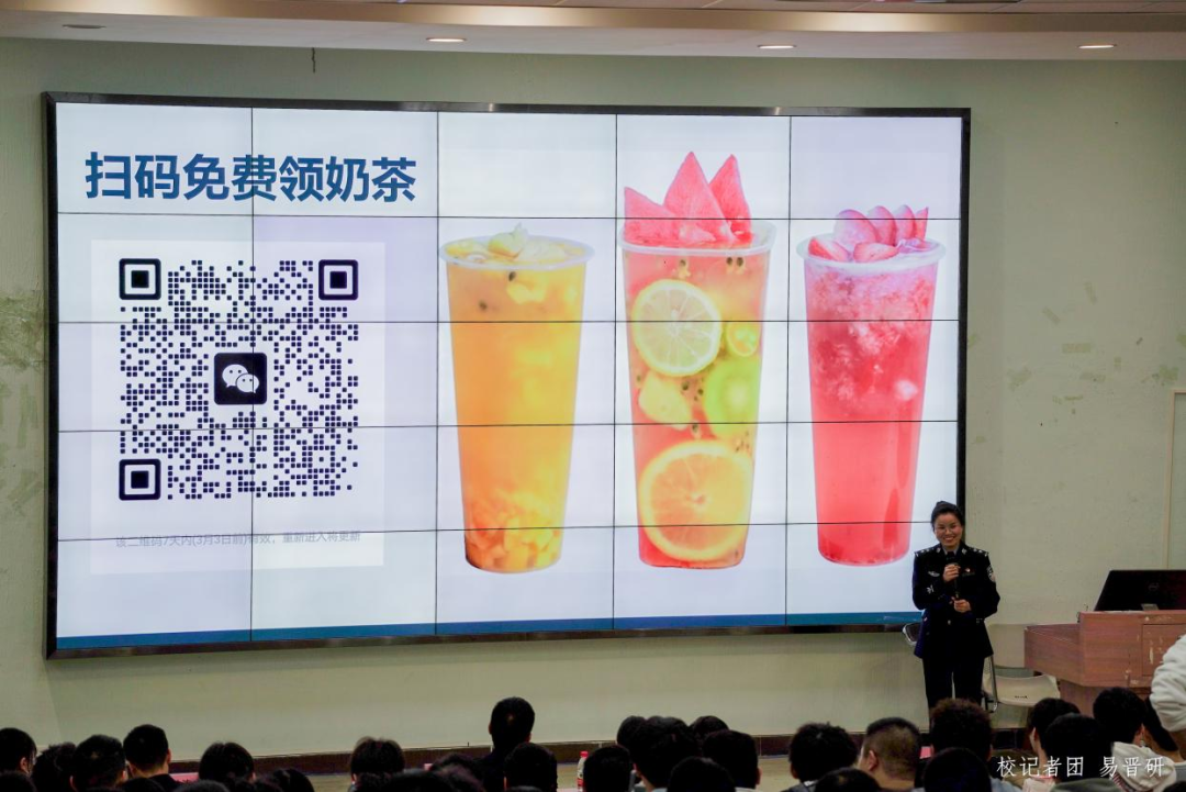 “同学们我请你们喝奶茶,来扫二维码进群吧!”