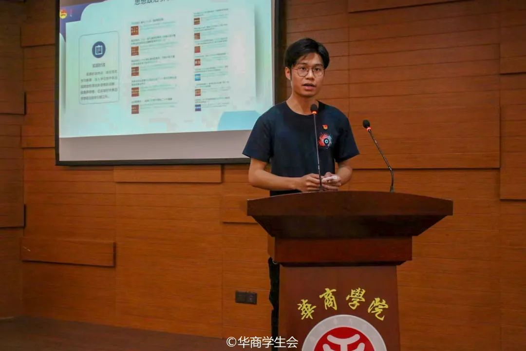 校团委大学生新媒体发展中心常委团成员何以立作述职汇报。新媒体发展中心紧跟时政热点,结合党史学习教育,深入学习党中央治国理政新理念新思想新战略,切实做好共青团思想政治宣传引领工作。打造以微信公众号为核心的新媒体平台阵地,通过网站、B站、微信视频号等平台辅助宣传,拓展青年舆论阵地;通过主题鲜明,贴近生活的原创作品,传递华商青年声音;通过毕业文创、街拍、街访等栏目拉进与华商师生的距离。校新媒体中心将不断完善组织管理体系,提升自身能力,继续当好“校园传声筒”。