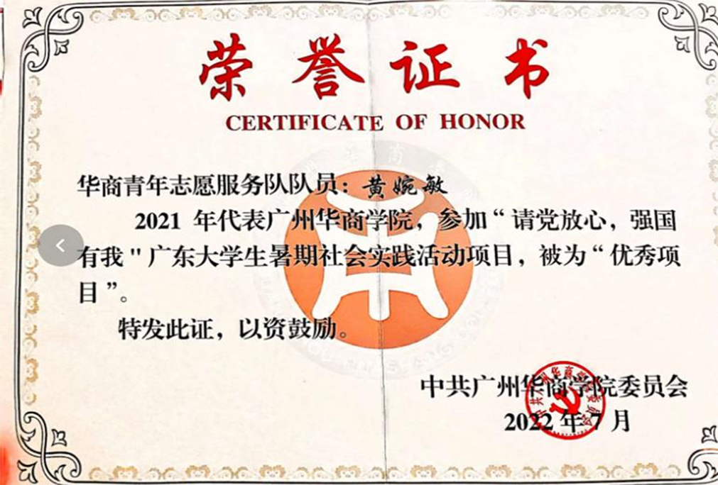坚持不懈,收获硕果累累。周婧同学积极参加校内外多项竞赛,锻炼各方面能力素质。曾获福州外国语学校“优秀共青团员”、2022广东省大学生科技创新专项资金哲学社会科学调查报告与学术论文类立项项目、第十四届全国大学生广告艺术大赛三等奖、第十五届大学生科技学术季活动之广东大学生社会治理调研大赛三等奖、伟德体育“十佳共青团干部”、伟德体育“优秀生”一等奖学金等。