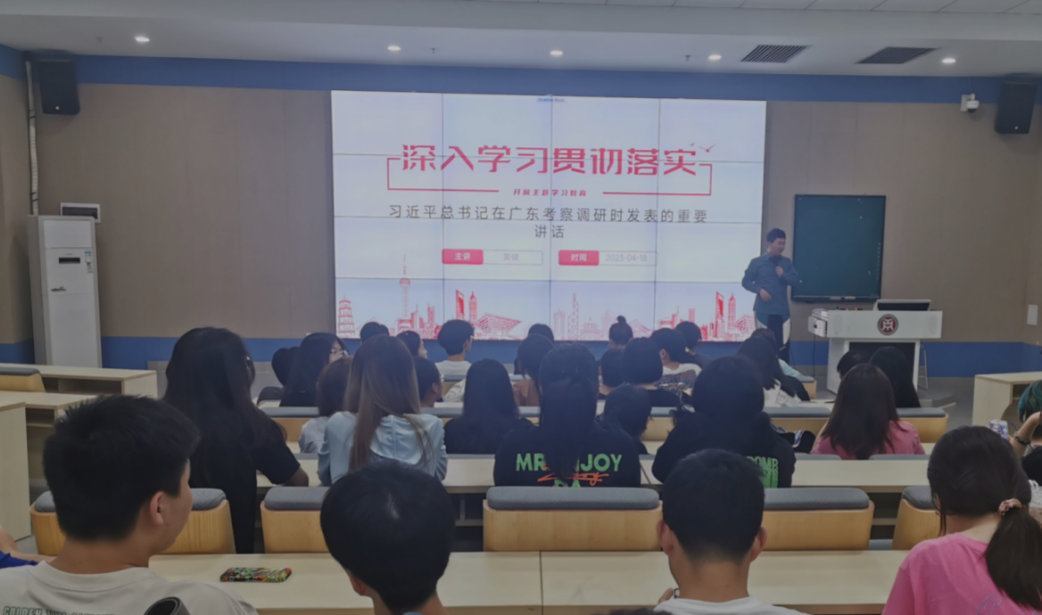 4月27日,经济贸易学院团委开展“深入学习贯彻习近平总书记在广东考察时的重要讲话精神”专题团课。经济贸易学院团委书记曾庆威老师以“争做四有青年,勇担时代使命”为切入点,传达了习近平总书记视察广东重要讲话精神。课上,曾庆威老师通过结合自身领悟以及播放相关视频的方式,给在场的所有学生骨干传达了习近平总书记视察广东重要讲话的精神。经济贸易学院22级全体班级学生骨干积极参与并深入探讨。最后,曾老师强调,作为学生骨干,要提高政治站位,提高政治自觉、思想自觉和行动自觉;要狠抓落实,学生骨干要带着感情、带着责任、带着使命将习近平总书记系列重要讲话精神宣传贯彻到学习和工作实处,掀起学习宣传贯彻的热潮;要注重运用理论指导实践、引领发展,开创学生工作新局面。