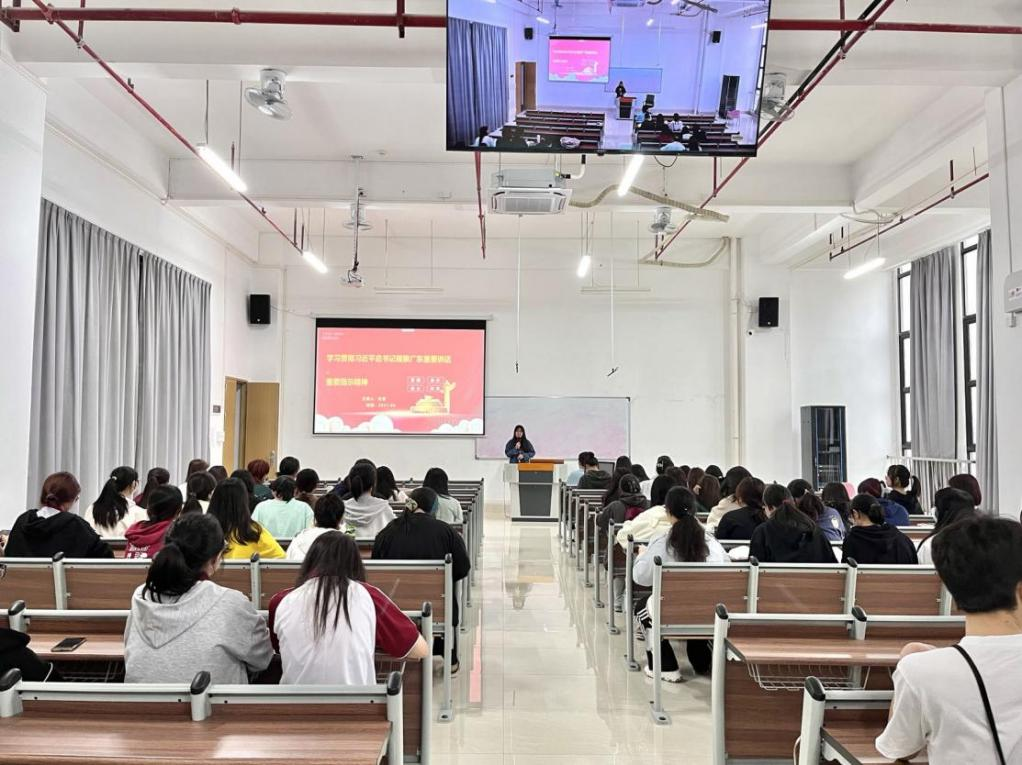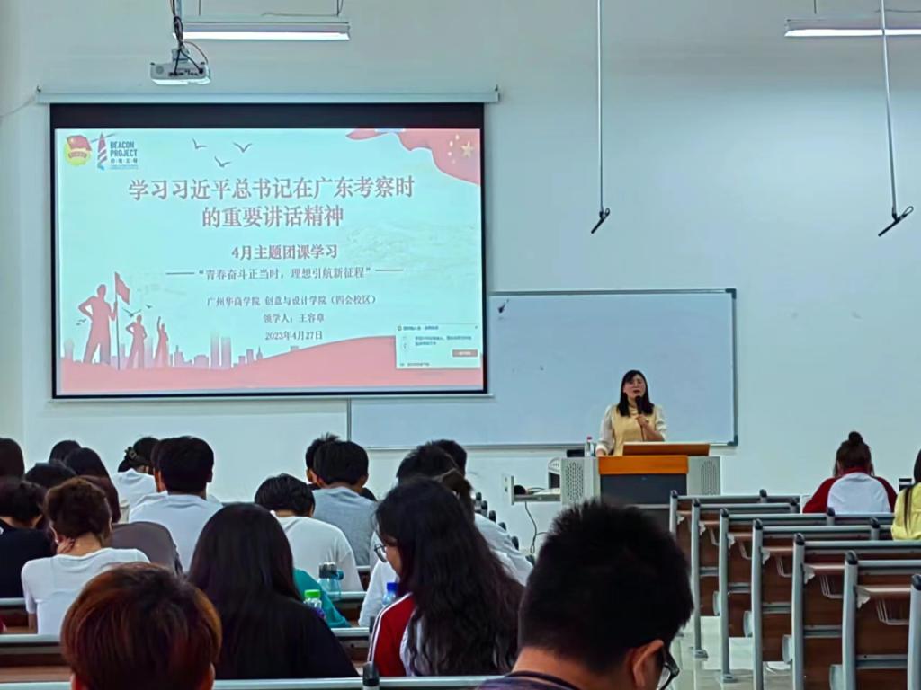 4月27日,创意与设计学院团委在励志楼B504组织开展“学习贯彻习近平总书记在广东考察时的重要讲话精神”主题团课,团委书记蔡舒授课,团学组织工作人员、各班团支书和团员代表参与本次课程。蔡老师强调,广大学生骨干要切实深入学习贯彻总书记重要讲话、重要指示精神,深入领会其丰富内涵、精神实质、实践要求和理论品格,自觉用以统一思想、统一意志、统一行动,坚定沿着总书记指引的方向继续前行。四会校区的主题团课由副书记王容章老师组织开展。王老师强调,同学们要主动承担使命,学深悟透,指导实践,以实际行动全力推进学习宣传贯彻习近平总书记重要讲话重要指示精神走深走实、落地见效。
