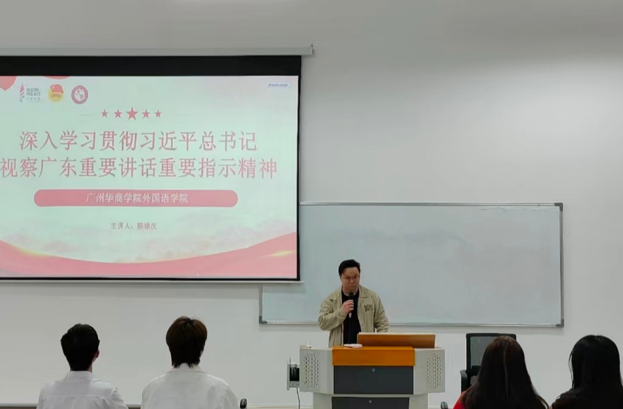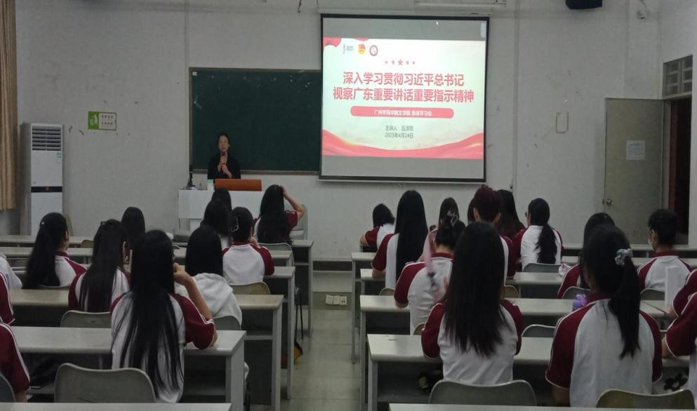 4月27日,外国语学院团委在增城校区励志楼C501、四会校区6号楼302组织开展“学习贯彻习近平总书记在广东考察时的重要讲话精神”主题团课。由外国语学院团委书记郭宇洁老师、团委副书记陈禄汉授课,带领外国语学院团委工作人员以及外国语学院各团支部学生骨干进行深入学习。