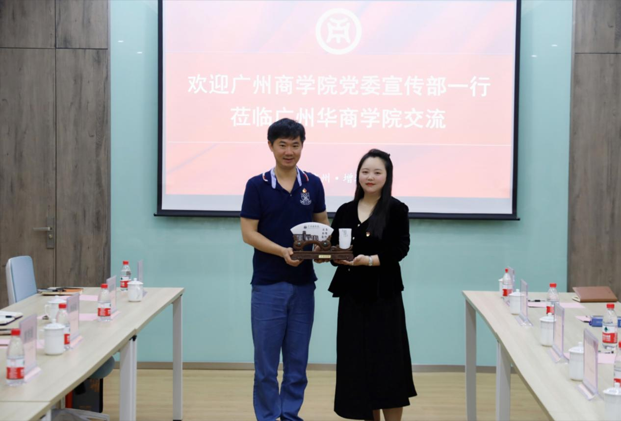 会后,广州商学院党委宣传部向我校党委宣传部送上精美的纪念品。