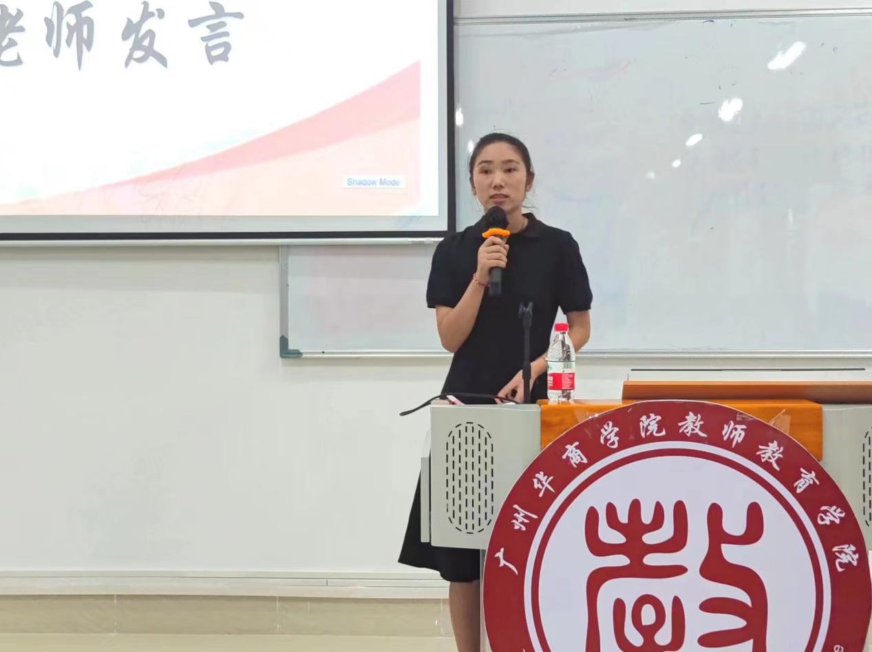 教师教育学院翟媛媛老师、赵中宝老师和宋元伟老师作为教师代表发言。翟媛媛老师希望同学们在大学生活中能够重塑自我,要注重实践,勇于创新,并把创新精神注入自我未来发展。赵中宝老师希望同学们要学会选择适合自己的领域去探索,创造并实现自我价值。宋元伟老师希望同学们要学会学习,更要学会生活。