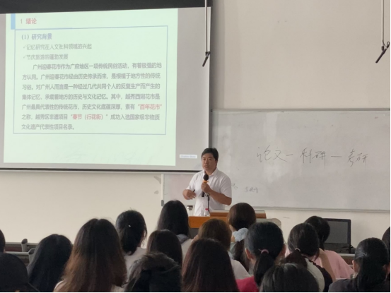 讲座伊始,廖教授与大家进行互动,并用自己的经历向大家介绍广州一年一度的迎春花市活动,就此拉开了讲座序幕。在正式开始今天的主题讲座前,廖教授依托自己专业的学科知识为大家构建起基本的论文研究体系,如:选择研究的案例是案例研究中的第一步,需要根据研究的目的和问题,选择具有代表性和典型性的案例地。廖教授对广州迎春花市有着非同一般的情怀,他指出,广州迎春花市在珠三角地区有着广泛的影响力,其规模之浩大,历史之悠久,非常值得研究和探索。