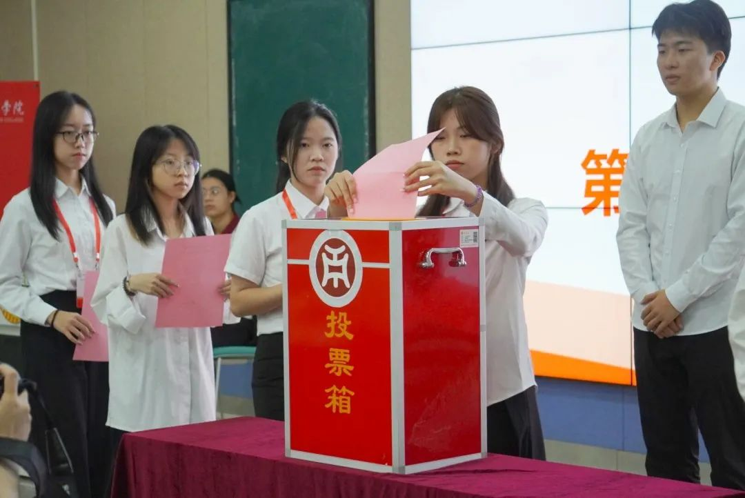在正式选举伟德体育教师教育学院第三届学生会委员会委员的环节中,各学生代表在监票人的监督下,庄严地将自己的选票投入投票箱。