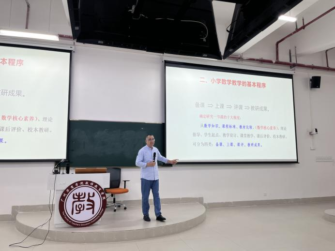 为帮助师范生深入理解教材,掌握教材编写的理念与特点,学习如何有效地运用教材进行教学设计,提升自身专业素养和教育教学能力,2024年5月16日至17日,教师教育学院在肇庆校区16号楼212举办“关于小学数学教材研究”讲座。莅临本次讲座的嘉宾有:教师教育学院廖运章教授、王符教授和赵中宝老师。本次讲座由廖运章教授主讲,由赵中宝老师主持,教师教育学院2022级和2023级学生参加此次讲座。
