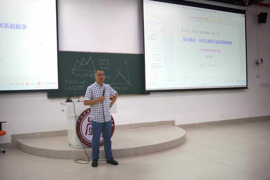 廖运章教授围绕《三角形三边关系》的课题,紧扣三角形三边的概念和三边之间的逻辑关系,讲解了如何研究教材,为上好一节课打下理论基础。他通过小学数学教材案例,展示了分析和研究教材的方式,并指出了教材编写中存在的逻辑关系混乱、定义不规范等问题。他鼓励同学们用批判性思维看待教材,调动自身发现问题的潜能,解决教学中的不足之处。
