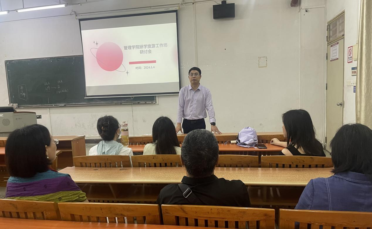 2024年6月4日,管理学院在励志楼C103举办研学旅游工作坊研讨会。此次研讨会由管理学院副院长袁仕海博士主持,参会人员有市场学系主任张丽娟副教授、旅游管理专业专任教师杜伟副教授、任欣鹭博士、何露、陈秀、吴艳芳等教师。