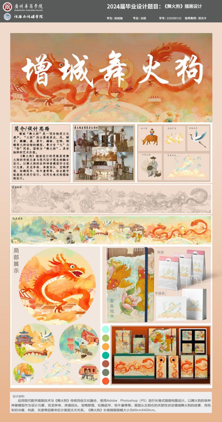 设计阐述:运用现代数字插画技术与《舞火狗》传统民俗文化融合,使用AdobePhotoshop(PS)进行长卷式插画构图设计。以舞火狗的各种神兽模型作为设计元素,双龙争珠、奔鹿回头、宝鸭穿莲、松鹤延年、牧牛童等等。画面从左到右的关联性讲述增城舞火狗的故事,用色彩的冷暖,纯度,灰度等因素来区分画面主次关系。《舞火狗》长卷插画画幅大小为60cmX420cm。