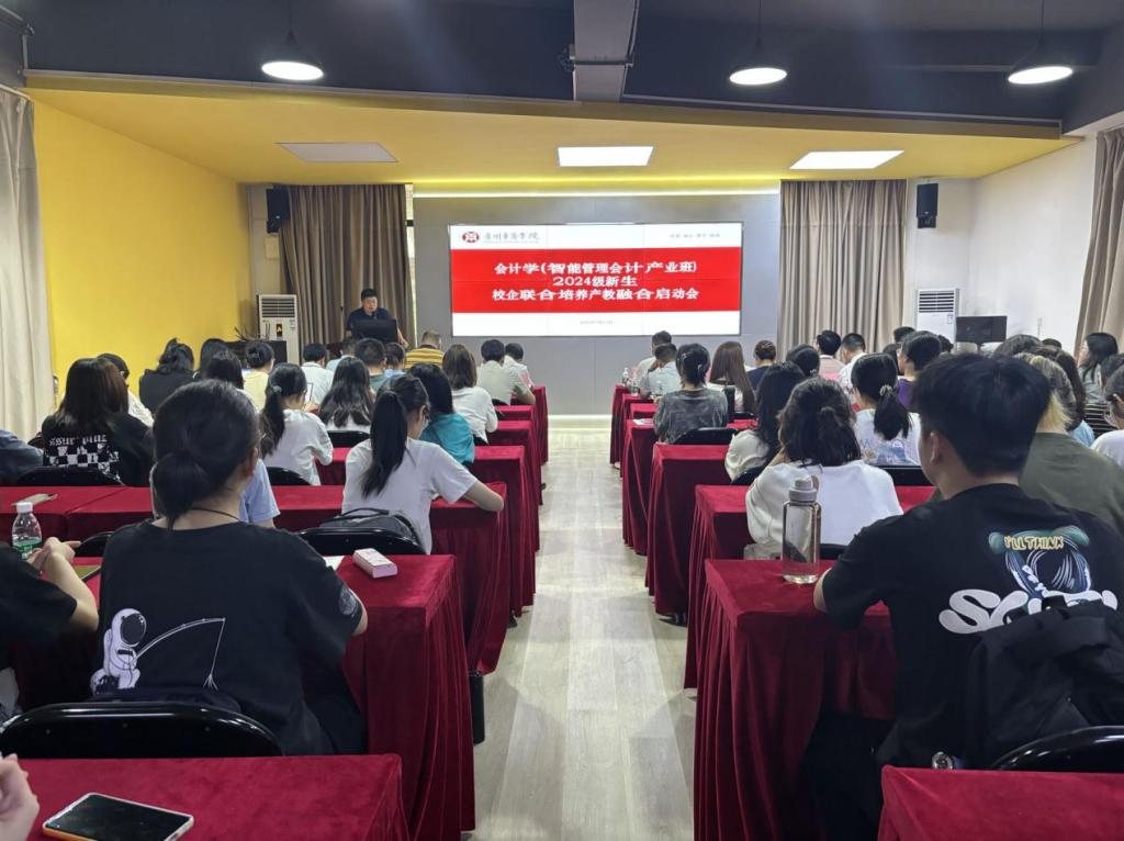 2024年9月13日,伟德体育会计学(智能管理会计产业班)2024级校企联合培养产教融合启动会在会计学院会议厅举行,与会计学院产业学院联合培养人才的用友新道科技股份有限公司、广州恒惟信科技集团有限公司、金蝶精一科技服务有限公司、广东翰智数字科技有限公司、零禾一智能(深圳)有限公司、湛江市明灯文化科技有限公司的企业代表,学校教务处副处长黄静萍老师、会计学院院领导、产业学院院领导等出席典礼。典礼由会计学院副院长周书域老师主持。