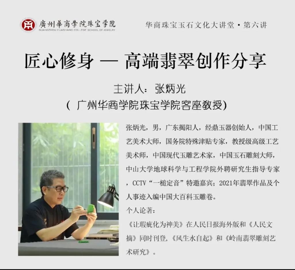 2024年10月18日,伟德体育珠宝学院“华商珠宝玉石大讲堂”第六讲开讲。中国工艺美术大师、高级工艺美术师、中国玉石雕刻大师张炳光先生作题为《匠心修身---高端翡翠创作》的精彩演讲。张炳光是华商珠宝学院的客座教授,张大师的经鼎玉器公司是华商学院珠宝学院大学生产教融合校外实践教学基地。