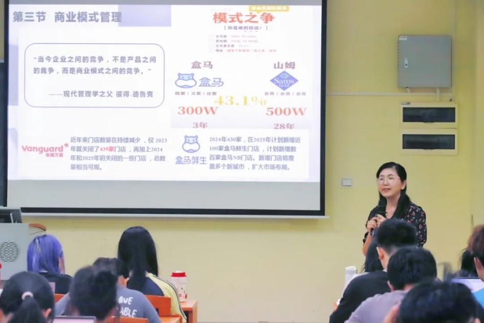 胡老师带领同学们进一步探讨了主流商业模式类型及其适用场景。她特别指出,商业模式创新需结合行业特性与企业资源,例如盒马鲜生借鉴山姆会员店模式,却通过“线上线下一体化”实现差异化突围,正是“借鉴提升法”的典范。她强调,创业者需从行业痛点出发,灵活组合模式要素,而非简单复制成功案例。