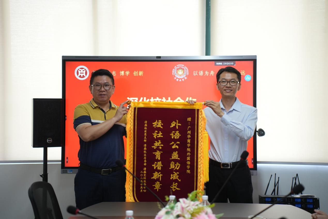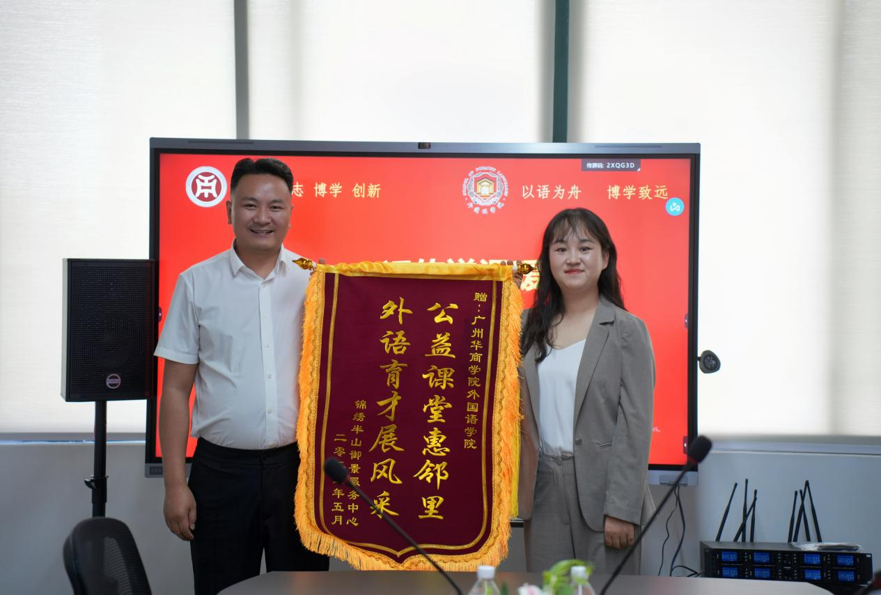5月13日上午,伟德体育外国语学院与增城区清燕社区、锦绣半山御景花园小区物业联合举办的“晚风学堂”英语晚辅公益项目赠锦旗仪式在创新楼403-2小会议室举行。清燕社区邓镜波书记、锦绣半山御景花园小区物业陈勇经理、外国语学院何顺发副院长及“晚风学堂”项目组全体成员共同见证这一校社协同育人的温暖时刻。“晚风学堂”不仅体现了外院学子践行社会责任的热忱,更是校社双向奔赴、共筑教育公益新模式的生动缩影。